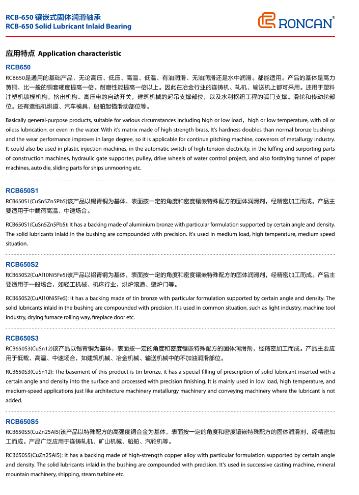 RCB650是通用的基礎產品,無論高壓、低壓、高溫、低溫、有油潤滑、無油潤滑還是水中潤滑。都能適用。產品的基體是高力黃銅,比一般的銅套硬度提高一倍。耐磨性能提高一倍以上。因此在冶金行業的連鑄機、軋機、輸送機上都可采用。還用于塑料注塑機鎖模機構,擠出機構。高壓電的自動開關,建筑機械的起吊支撐部位,以及水利樞紐工程的弧門支撐。滑輪和傳動輪部位。還有造紙機烘道、汽車模具、船舶起錨滑動部位等。